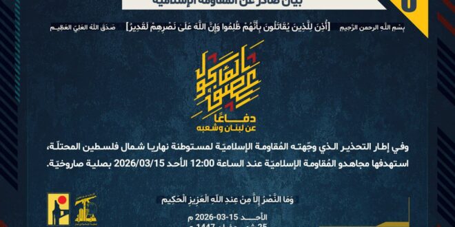 دفاعًا عن لبنان وشعبه، وفي إطار التحذير الذي وجّهته المُقاومة الإسلاميّة لمستوطنة نهاريا شمال فلسطين المحتلّة، استهدفها مجاهدو المُقاومة الإسلاميّة عند الساعة 12:00 الأحد 15/03/2026 بصلية صاروخيّة.