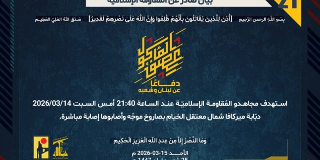 دفاعًا عن لبنان وشعبه، استهدف مجاهدو المُقاومة الإسلاميّة عند الساعة 21:40 أمس السبت 14/03/2026 دبّابة ميركافا شمال معتقل الخيام بصاروخ موجّه وأصابوها إصابة مباشرة.