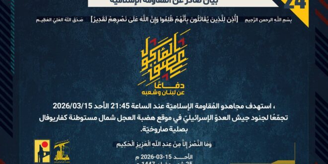 دفاعًا عن لبنان وشعبه، استهدف مجاهدو المُقاومة الإسلاميّة عند الساعة 21:45 الأحد 15/03/2026 تجمّعًا لجنود جيش العدوّ الإسرائيليّ في موقع هضبة العجل شمال مستوطنة كفاريوفال بصلية صاروخيّة.