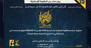 دفاعًا عن لبنان وشعبه، استهدف مجاهدو المُقاومة الإسلاميّة عند الساعة 17:00 الإثنين 16/03/2026 تجمّعًا لجنود جيش العدوّ الإسرائيليّ في مستوطنة شوميرا بصليةٍ صاروخيّة.