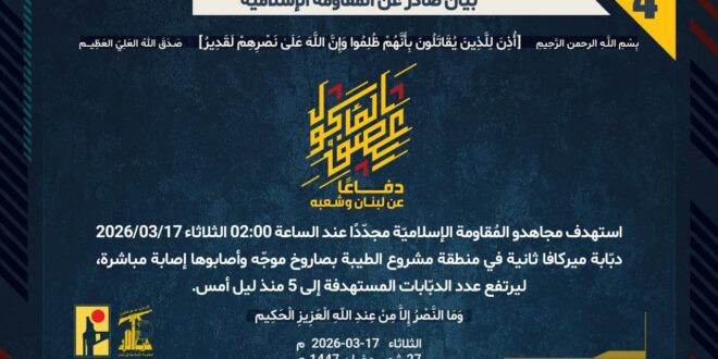 دفاعًا عن لبنان وشعبه، استهدف مجاهدو المُقاومة الإسلاميّة مجدّدًا عند الساعة 02:00 الثلاثاء 17/03/2026 دبّابة ميركافا ثانية في منطقة مشروع الطيبة بصاروخ موجّه وأصابوها إصابة مباشرة، ليرتفع عدد الدبّابات المستهدفة إلى 5 منذ ليل أمس.