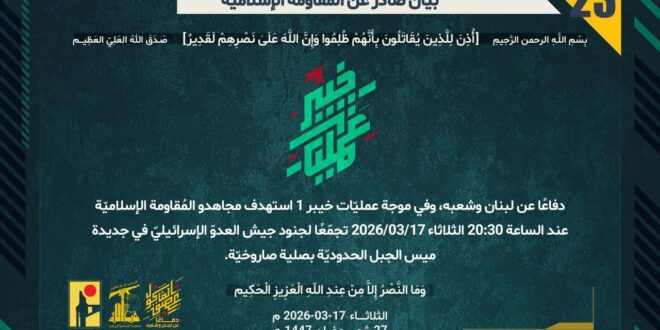 دفاعًا عن لبنان وشعبه، وفي موجة عمليّات خيبر 1 استهدف مجاهدو المُقاومة الإسلاميّة عند الساعة 20:30 الثلاثاء 17/03/2026 تجمّعًا لجنود جيش العدوّ الإسرائيليّ في جديدة ميس الجبل الحدوديّة بصلية صاروخيّة.