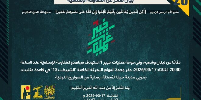 دفاعًا عن لبنان وشعبه، وفي موجة عمليّات خيبر 1 استهدف مجاهدو المُقاومة الإسلاميّة عند الساعة 20:30 الثلاثاء 17/03/2026، مقر وحدة المهام البحريّة الخاصة “الشييطت 13” في قاعدة عتليت، جنوبي مدينة حيفا المُحتلّة، بصلية من الصواريخ النوعيّة.