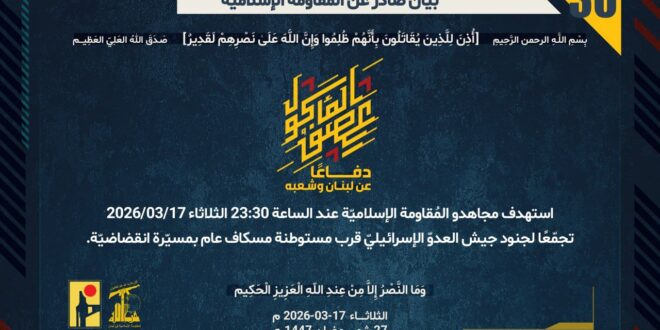 دفاعًا عن لبنان وشعبه، استهدف مجاهدو المُقاومة الإسلاميّة عند الساعة 23:30 الثلاثاء 17/03/2026 تجمّعًا لجنود جيش العدوّ الإسرائيليّ قرب مستوطنة مسكاف عام بمسيّرة انقضاضيّة.
