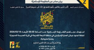 دفاعًا عن لبنان وشعبه، استهدف مجاهدو المُقاومة الإسلاميّة عند الساعة 02:00 الأربعاء 18/03/2026 تجمّعًا لجنود جيش العدوّ الإسرائيليّ في تلّة الخزّان في العديسة الحدوديّة بصليةٍ صاروخيّة.