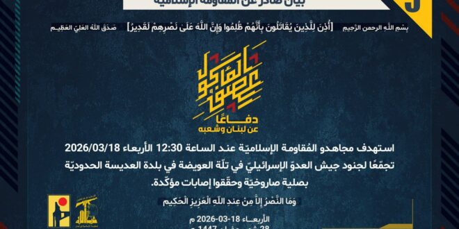 دفاعًا عن لبنان وشعبه، استهدف مجاهدو المُقاومة الإسلاميّة عند الساعة 12:30 الأربعاء 18/03/2026 تجمّعًا لجنود جيش العدوّ الإسرائيليّ في تلّة العويضة في بلدة العديسة الحدوديّة بصلية صاروخيّة وحقّقوا إصابات مؤكّدة.