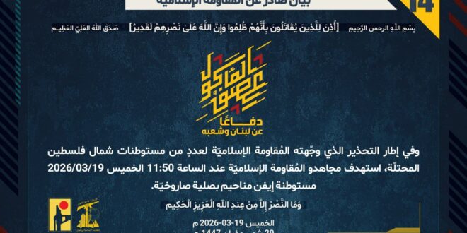 دفاعًا عن لبنان وشعبه، وفي إطار التحذير الذي وجّهته المُقاومة الإسلاميّة لعددٍ من مستوطنات شمال فلسطين المحتلّة، استهدف مجاهدو المُقاومة الإسلاميّة عند الساعة 11:50 الخميس 19/03/2026 مستوطنة إيفن مناحيم بصلية صاروخيّة.