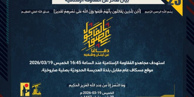 دفاعًا عن لبنان وشعبه، استهدف مجاهدو المُقاومة الإسلاميّة عند الساعة 16:45 الخميس 19/03/2026 موقع مسكاف عام مقابل بلدة العديسة الحدوديّة بصلية صاروخيّة.