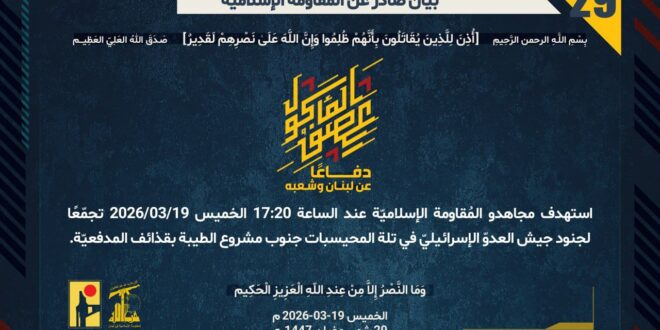 دفاعًا عن لبنان وشعبه، استهدف مجاهدو المُقاومة الإسلاميّة عند الساعة 17:20 الخميس 19/03/2026 تجمّعًا لجنود جيش العدوّ الإسرائيليّ في تلة المحيسبات جنوب مشروع الطيبة بقذائف المدفعيّة.