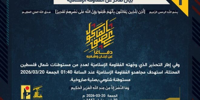 دفاعًا عن لبنان وشعبه، وفي إطار التحذير الذي وجّهته المُقاومة الإسلاميّة لعددٍ من مستوطنات شمال فلسطين المحتلة، استهدف مجاهدو المُقاومة الإسلاميّة عند الساعة 01:40 الجمعة 20/03/2026 مستوطنة شلومي بصلية صاروخية.