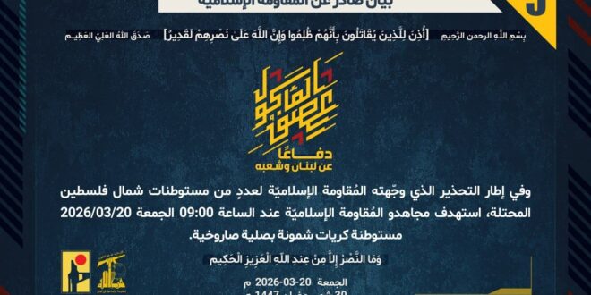 دفاعًا عن لبنان وشعبه، وفي إطار التحذير الذي وجّهته المُقاومة الإسلاميّة لعددٍ من مستوطنات شمال فلسطين المحتلة، استهدف مجاهدو المُقاومة الإسلاميّة عند الساعة 09:00 الجمعة 20/03/2026 مستوطنة كريات شمونة بصلية صاروخية.