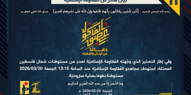 دفاعًا عن لبنان وشعبه، وفي إطار التحذير الذي وجّهته المُقاومة الإسلاميّة لعددٍ من مستوطنات شمال فلسطين المحتلة، استهدف مجاهدو المُقاومة الإسلاميّة عند الساعة 13:15 الجمعة 20/03/2026 مستوطنة نطوعا بصلية صاروخيّة.