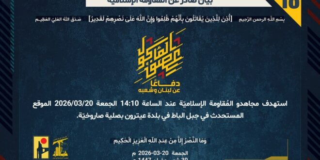 دفاعًا عن لبنان وشعبه، استهدف مجاهدو المُقاومة الإسلاميّة عند الساعة 14:10 الجمعة 20/03/2026 الموقع المستحدث في جبل الباط في بلدة عيترون بصلية صاروخيّة.