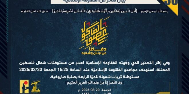 دفاعًا عن لبنان وشعبه، وفي إطار التحذير الذي وجّهته المُقاومة الإسلاميّة لعددٍ من مستوطنات شمال فلسطين المحتلة، استهدف مجاهدو المُقاومة الإسلاميّة عند الساعة 16:25 الجمعة 20/03/2026 مستوطنة كريات شمونة للمرّة الرابعة بصليةٍ صاروخية.