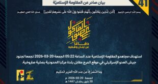 دفاعًا عن لبنان وشعبه، وفي إطار التحذير الذي وجّهته المُقاومة الإسلاميّة لعددٍ من مستوطنات شمال فلسطين المحتلة، استهدف مجاهدو المُقاومة الإسلاميّة عند الساعة 17:00 الجمعة 20/03/2026 مستوطنة كريات شمونة للمرّة الخامسة بصليةٍ صاروخية.