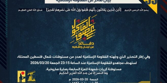 دفاعًا عن لبنان وشعبه، وفي إطار التحذير الذي وجّهته المُقاومة الإسلاميّة لعددٍ من مستوطنات شمال فلسطين المحتلة، استهدف مجاهدو المُقاومة الإسلاميّة عند الساعة 23:15 الجمعة 20/03/2026 مستوطنة كريات شمونة للمرّة السابعة بصليةٍ صاروخية.