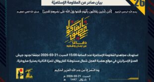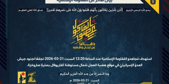 دفاعًا عن لبنان وشعبه، استهدف مُجاهدو المُقاومة الإسلاميّة عند الساعة 12:20 السبت 21-03-2026 تجمّعًا لجنود جيش العدوّ الإسرائيليّ في موقع هضبة العجل شمال مستوطنة كفاريوفال بصليةٍ صاروخيّة.