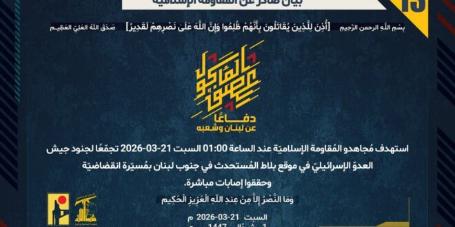 دفاعًا عن لبنان وشعبه، استهدف مُجاهدو المُقاومة الإسلاميّة عند الساعة 01:00 السبت 21-03-2026 تجمّعًا لجنود جيش العدوّ الإسرائيليّ في موقع بلاط المُستحدث في جنوب لبنان بمُسيّرة انقضاضيّة وحققوا إصابات مباشرة.
