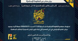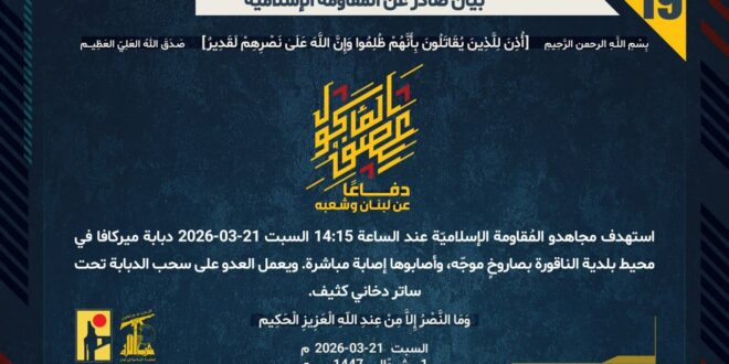 دفاعًا عن لبنان وشعبه، استهدف مجاهدو المُقاومة الإسلاميّة عند الساعة 14:15 السبت 21-03-2026 دبابة ميركافا في محيط بلدية الناقورة بصاروخٍ موجّه، وأصابوها إصابة مباشرة. ويعمل العدو على سحب الدبابة تحت ساتر دخاني كثيف.