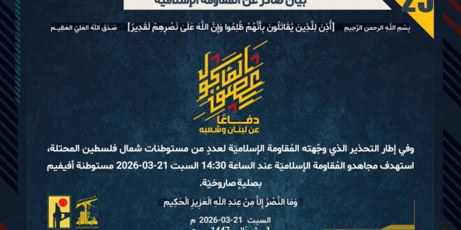 دفاعًا عن لبنان وشعبه، وفي إطار التحذير الذي وجّهته المُقاومة الإسلاميّة لعددٍ من مستوطنات شمال فلسطين المحتلة، استهدف مجاهدو المُقاومة الإسلاميّة عند الساعة 14:30 السبت 21-03-2026 مستوطنة أفيفيم بصليةٍ صاروخيّة.