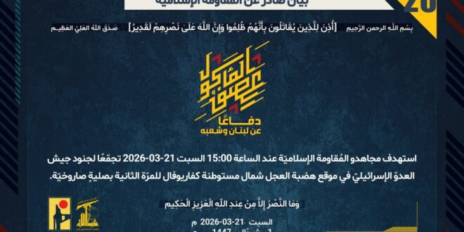 دفاعًا عن لبنان وشعبه، استهدف مجاهدو المُقاومة الإسلاميّة عند الساعة 15:00 السبت 21-03-2026 تجمّعًا لجنود جيش العدوّ الإسرائيليّ في موقع هضبة العجل شمال مستوطنة كفاريوفال للمرّة الثانية بصليةٍ صاروخيّة.