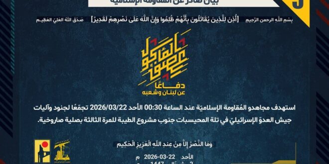 دفاعًا عن لبنان وشعبه، استهدف مجاهدو المُقاومة الإسلاميّة عند الساعة 00:30 الأحد 22/03/2026 تجمّعًا لجنود وآليات جيش العدوّ الإسرائيليّ في تلة المحيسبات جنوب مشروع الطيبة، للمرّة الثالثة، بصلية صاروخية.