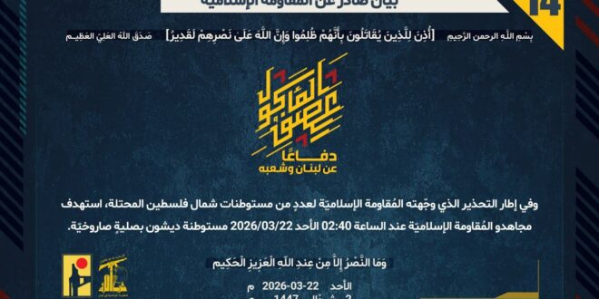 دفاعًا عن لبنان وشعبه، وفي إطار التحذير الذي وجّهته المُقاومة الإسلاميّة لعددٍ من مستوطنات شمال فلسطين المحتلة، استهدف مجاهدو المُقاومة الإسلاميّة عند الساعة 02:40 الأحد 22/03/2026 مستوطنة ديشون بصليةٍ صاروخيّة.