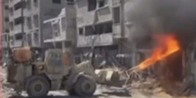 تنشر مقطع فيديو من قطاع غزة، تظهر فيه آلية إسرائيلية مربوطة بخرطوم يطلق السولار والوقود باتجاه أحد المباني السكنية في قطاع غزة.