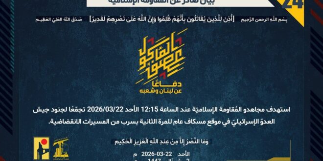 دفاعًا عن لبنان وشعبه، استهدف مجاهدو المُقاومة الإسلاميّة عند الساعة 12:15 الأحد 22/03/2026 تجمّعًا لجنود جيش العدوّ الإسرائيليّ في موقع مسكاف عام للمرة الثانية بسرب من المسيرات الانقضاضية.