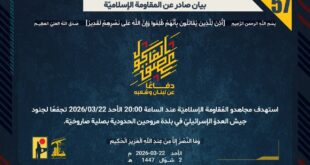 دفاعًا عن لبنان وشعبه، استهدف مجاهدو المُقاومة الإسلاميّة عند الساعة 16:35 الأحد 22/03/2026 تجمّعًا لجنود جيش العدوّ الإسرائيليّ شرق بلدة الناقورة بصليةٍ صاروخيّة.
