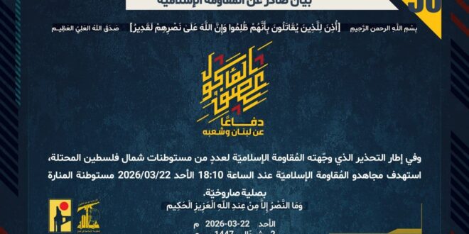 دفاعًا عن لبنان وشعبه، وفي إطار التحذير الذي وجّهته المُقاومة الإسلاميّة لعددٍ من مستوطنات شمال فلسطين المحتلة، استهدف مجاهدو المُقاومة الإسلاميّة عند الساعة 18:10 الأحد 22/03/2026 مستوطنة المنارة بصلية صاروخيّة.
