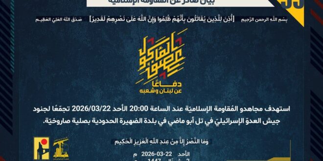 دفاعًا عن لبنان وشعبه، استهدف مجاهدو المُقاومة الإسلاميّة عند الساعة 20:00 الأحد 22/03/2026 تجمّعًا لجنود جيش العدوّ الإسرائيليّ في تل أبو ماضي في بلدة الضهيرة الحدودية بصلية صاروخيّة.