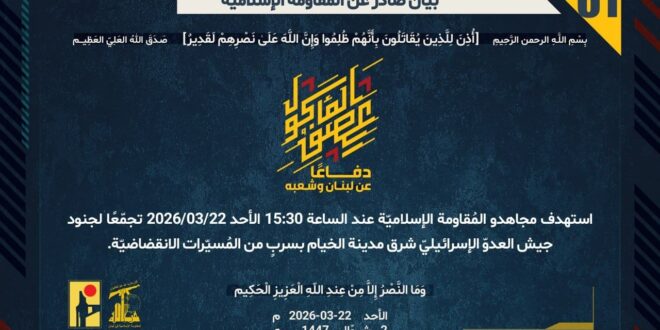 دفاعًا عن لبنان وشعبه، استهدف مجاهدو المُقاومة الإسلاميّة عند الساعة 15:30 الأحد 22/03/2026 تجمّعًا لجنود جيش العدوّ الإسرائيليّ شرق مدينة الخيام بسربٍ من المُسيّرات الانقضاضيّة.