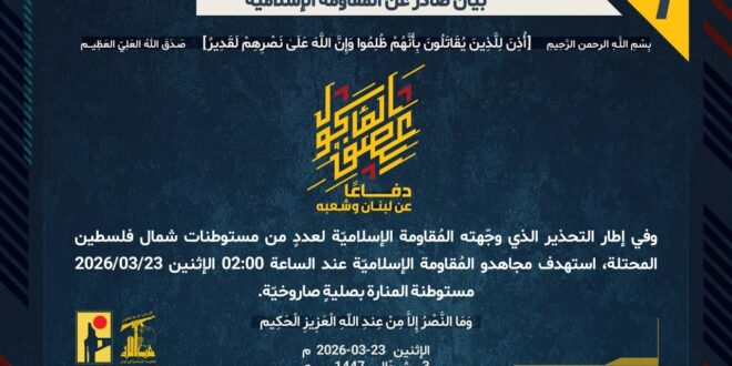 دفاعًا عن لبنان وشعبه، وفي إطار التحذير الذي وجّهته المُقاومة الإسلاميّة لعددٍ من مستوطنات شمال فلسطين المحتلة، استهدف مجاهدو المُقاومة الإسلاميّة عند الساعة 02:00 الإثنين 23/03/2026 مستوطنة المنارة بصليةٍ صاروخيّة.