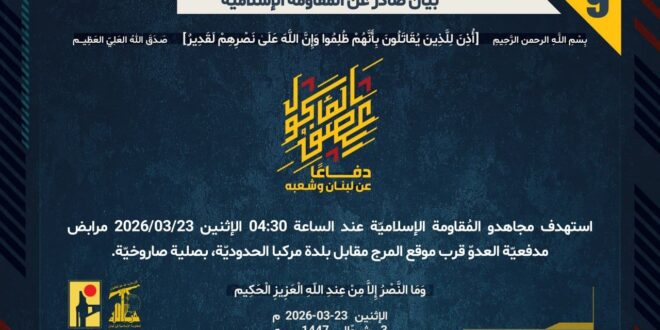 دفاعًا عن لبنان وشعبه، استهدف مجاهدو المُقاومة الإسلاميّة عند الساعة 04:30 الإثنين 23/03/2026 مرابض مدفعيّة العدوّ قرب موقع المرج مقابل بلدة مركبا الحدوديّة، بصلية صاروخيّة.