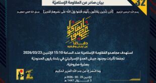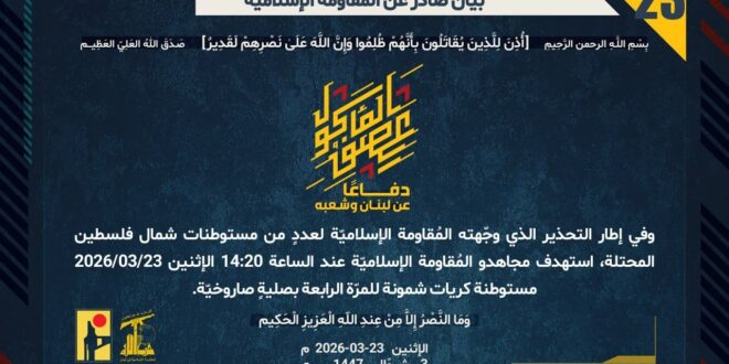 دفاعًا عن لبنان وشعبه، وفي إطار التحذير الذي وجّهته المُقاومة الإسلاميّة لعددٍ من مستوطنات شمال فلسطين المحتلة، استهدف مجاهدو المُقاومة الإسلاميّة عند الساعة 14:20 الإثنين 23/03/2026 مستوطنة كريات شمونة للمرّة الرابعة بصليةٍ صاروخيّة.