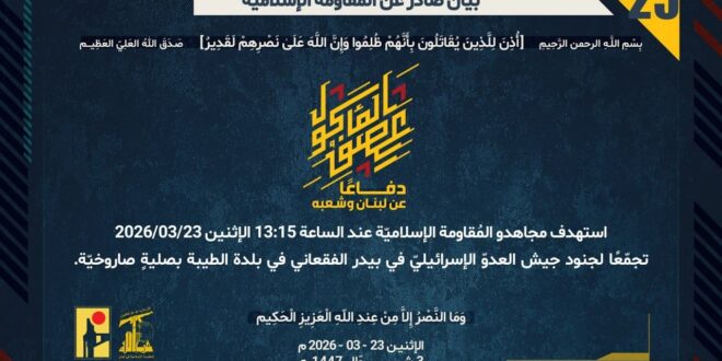 دفاعًا عن لبنان وشعبه، استهدف مجاهدو المُقاومة الإسلاميّة عند الساعة 13:15 الإثنين 23/03/2026 تجمّعًا لجنود جيش العدوّ الإسرائيليّ في بيدر الفقعاني في بلدة الطيبة بصليةٍ صاروخيّة.