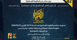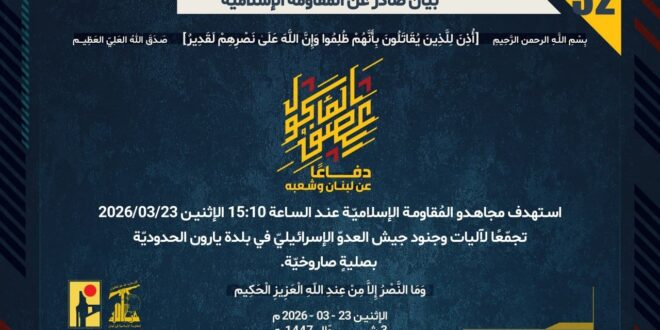 دفاعًا عن لبنان وشعبه، استهدف مجاهدو المُقاومة الإسلاميّة عند الساعة 15:10 الإثنين 23/03/2026 تجمّعًا لآليات وجنود جيش العدوّ الإسرائيليّ في بلدة يارون الحدوديّة بصليةٍ صاروخيّة.
