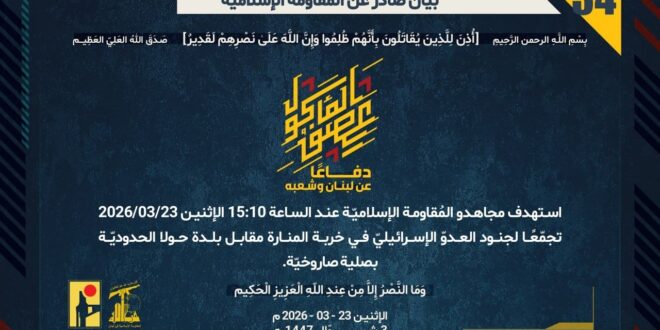 دفاعًا عن لبنان وشعبه، استهدف مجاهدو المُقاومة الإسلاميّة عند الساعة 15:10 الإثنين 23/03/2026 تجمّعًا لجنود العدوّ الإسرائيليّ في خربة المنارة مقابل بلدة حولا الحدوديّة بصلية صاروخيّة.