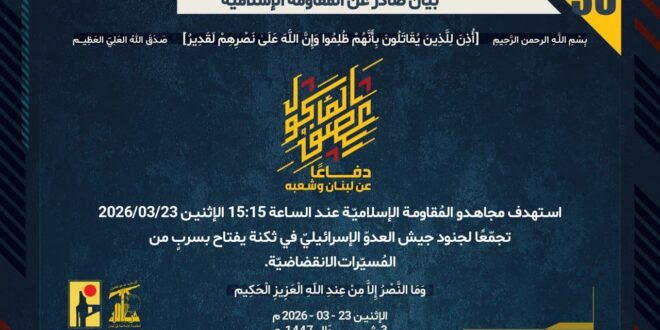 دفاعًا عن لبنان وشعبه، استهدف مجاهدو المُقاومة الإسلاميّة عند الساعة 15:15 الإثنين 23/03/2026 تجمّعًا لجنود جيش العدوّ الإسرائيليّ في ثكنة يفتاح بسربٍ من المُسيّرات الانقضاضيّة.