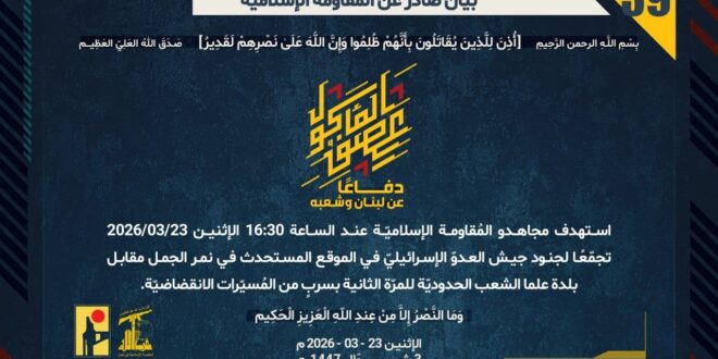 دفاعًا عن لبنان وشعبه، استهدف مجاهدو المُقاومة الإسلاميّة عند الساعة 16:30 الإثنين 23/03/2026 تجمّعًا لجنود جيش العدوّ الإسرائيليّ في الموقع المستحدث في نمر الجمل مقابل بلدة علما الشعب الحدوديّة للمرّة الثانية بسربٍ من المُسيّرات الانقضاضيّة.
