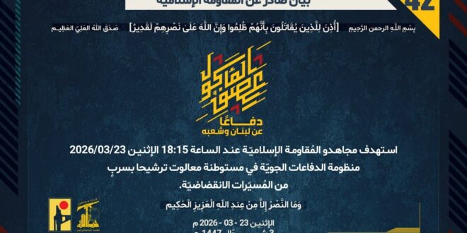 دفاعًا عن لبنان وشعبه، استهدف مجاهدو المُقاومة الإسلاميّة عند الساعة 18:15 الإثنين 23/03/2026 منظومة الدفاعات الجويّة في مستوطنة معالوت ترشيحا بسربٍ من المُسيّرات الانقضاضيّة.