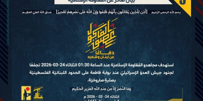 دفاعًا عن لبنان وشعبه، استهدف مجاهدو المُقاومة الإسلاميّة عند الساعة 01:30 الثلاثاء 24-03-2026 تجمّعًا لجنود جيش العدوّ الإسرائيليّ عند بوابة فاطمة على الحدود اللبنانيّة الفلسطينيّة بصليةٍ صاروخيّة.