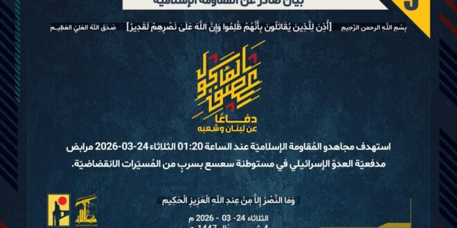 دفاعًا عن لبنان وشعبه، استهدف مجاهدو المُقاومة الإسلاميّة عند الساعة 01:20 الثلاثاء 24-03-2026 مرابض مدفعيّة العدوّ الإسرائيلي في مستوطنة سعسع بسربٍ من المُسيّرات الانقضاضيّة.