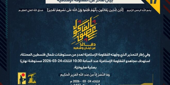 دفاعًا عن لبنان وشعبه، وفي إطار التحذير الذي وجّهته المُقاومة الإسلاميّة لعددٍ من مستوطنات شمال فلسطين المحتلة، استهدف مجاهدو المُقاومة الإسلاميّة عند الساعة 10:30 الثلاثاء 24-03-2026 مستوطنة نهاريّا بصلية صاروخيّة.