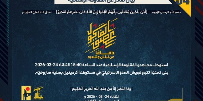 دفاعًا عن لبنان وشعبه، استهدف مجاهدو المُقاومة الإسلاميّة عند الساعة 15:40 الثلاثاء 24-03-2026 بنى تحتيّة تتبع لجيش العدوّ الإسرائيليّ في مستوطنة كرميئيل بصلية صاروخيّة.
