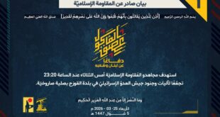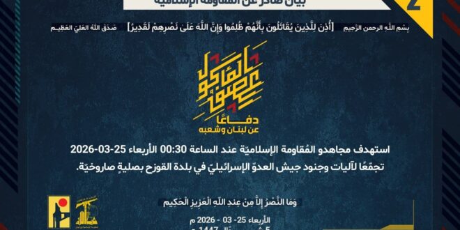 دفاعًا عن لبنان وشعبه، استهدف مجاهدو المُقاومة الإسلاميّة عند الساعة 00:30 الأربعاء 25-03-2026 تجمّعًا لآليات وجنود جيش العدوّ الإسرائيليّ في بلدة القوزح بصليةٍ صاروخيّة.