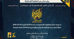 دفاعًا عن لبنان وشعبه، استهدف مجاهدو المُقاومة الإسلاميّة عند الساعة 14:20 الأربعاء 25-03-2026 بنى تحتيّة تتبع لجيش العدوّ الإسرائيليّ في مستوطنة معالوت تشريحا بصلية صاروخيّة.