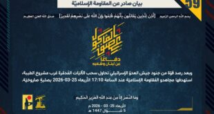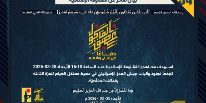 دفاعًا عن لبنان وشعبه، استهدف مجاهدو المُقاومة الإسلاميّة عند الساعة 16:10 الأربعاء 25-03-2026 تجمّعًا لجنود وآليات جيش العدوّ الإسرائيليّ في محيط معتقل الخيام للمرّة الثالثة بقذائف المدفعيّة.