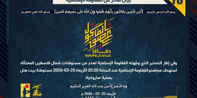 دفاعًا عن لبنان وشعبه، وفي إطار التحذير الذي وجّهته المُقاومة الإسلاميّة لعددٍ من مستوطنات شمال فلسطين المحتلّة، استهدف مجاهدو المُقاومة الإسلاميّة عند الساعة 20:20 الأربعاء 25-03-2026 مستوطنة بيت هلل بصليةٍ صاروخيّة.